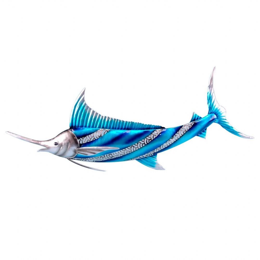A blue metal marlin plaque measuring 65.5 x 26cm
