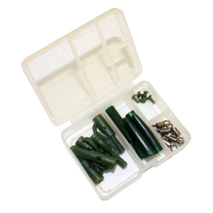 A box containing everything you need to make semi fixed bait rigs or a quick release system for your leads. Comes complete with safety carp clips, tail rubbers, swivels and swivel stops.